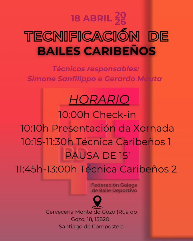 A Federación Galega de Baile Deportivo organizará o vindeiro 18 de abril unha xornada de tecnificación en bailes caribeños, que terá lugar en Santiago de Compostela.